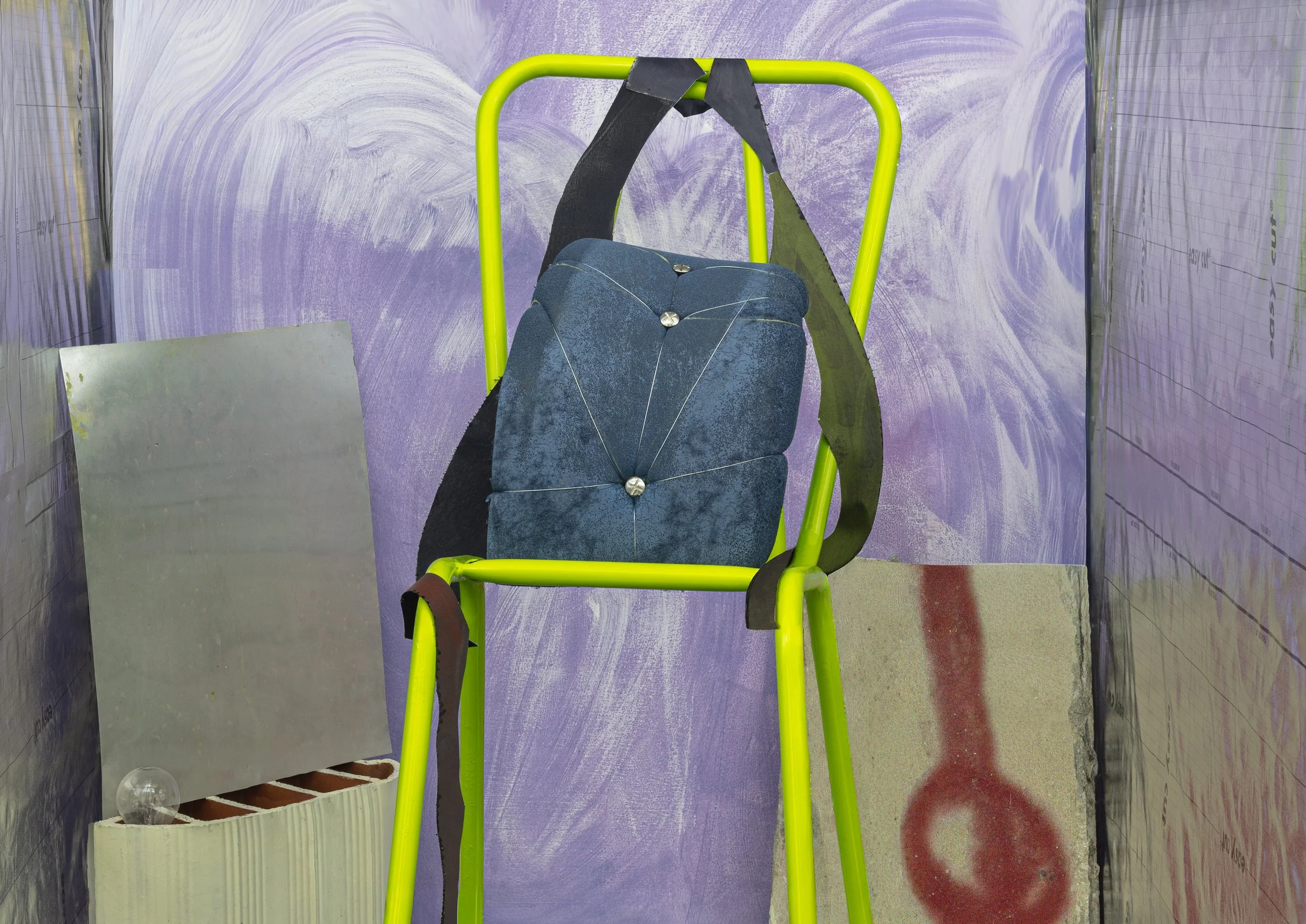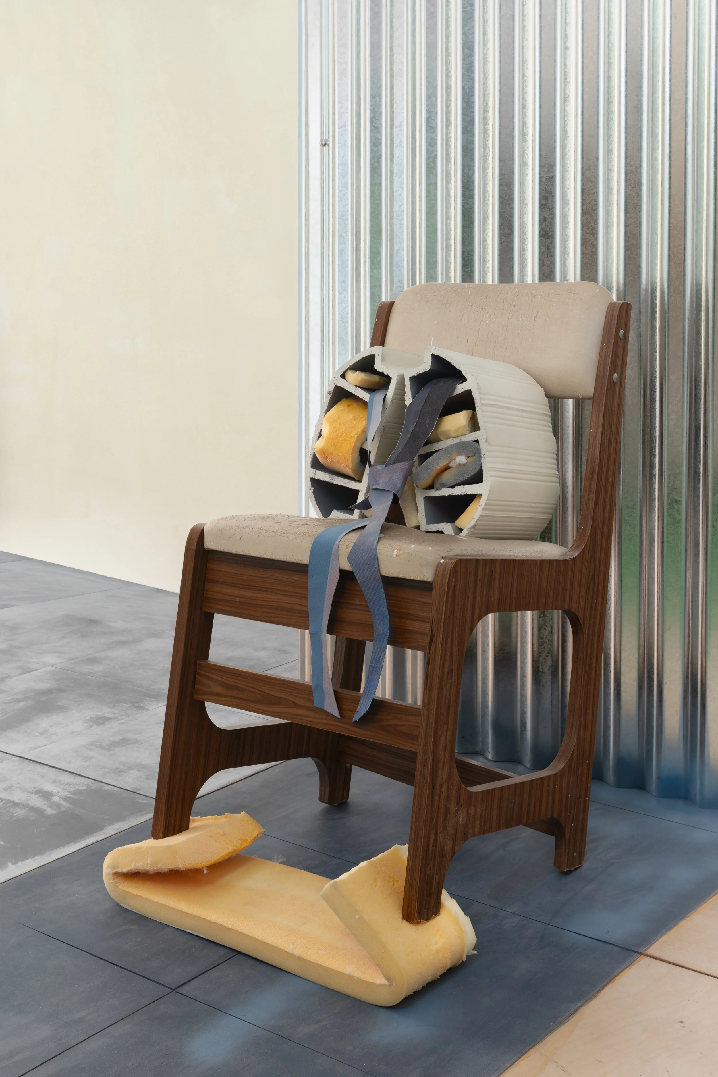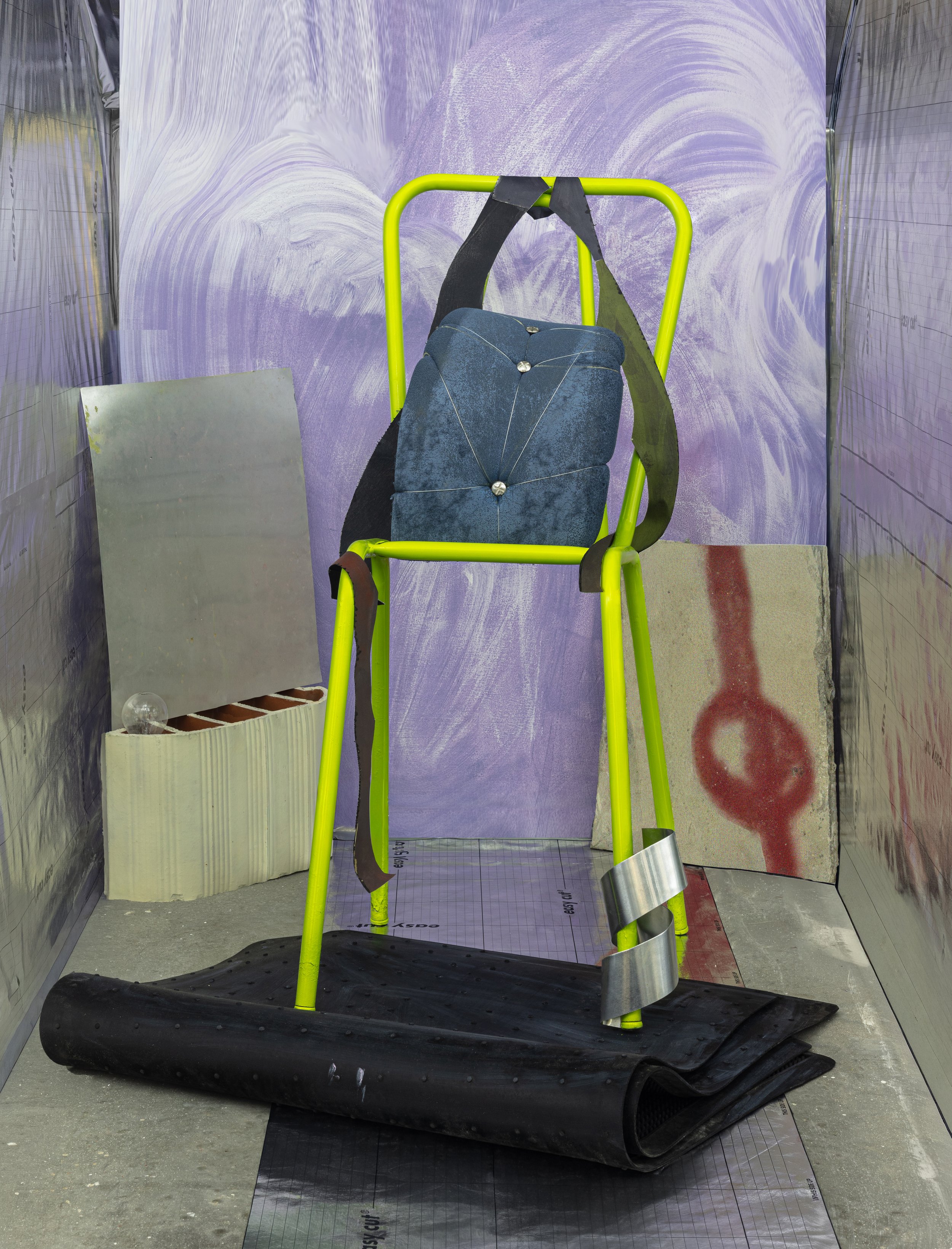 aluminum sheets, aluminum chair frame, painted cushioning, wire, bolts, nuts, failed acrylic paintings
