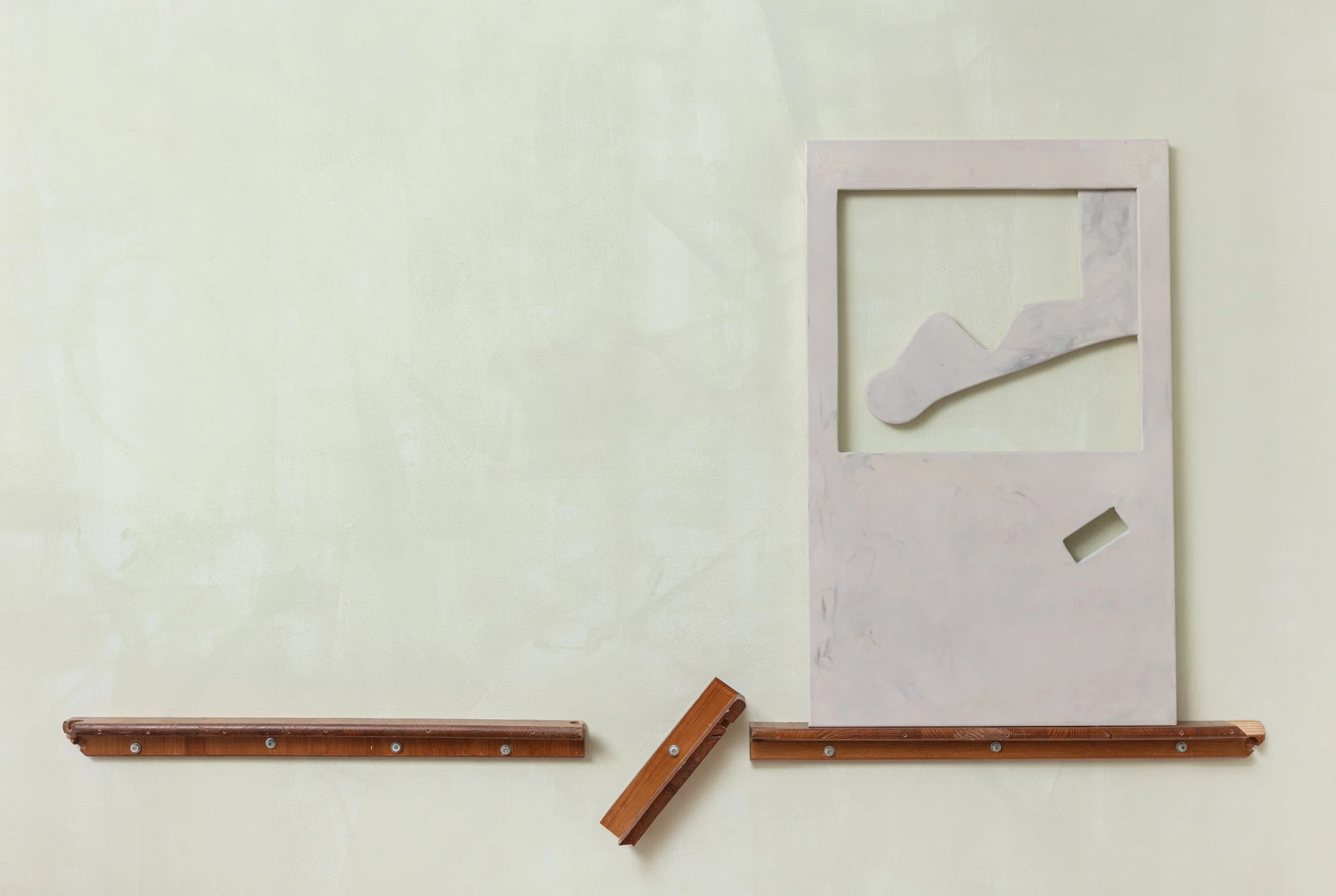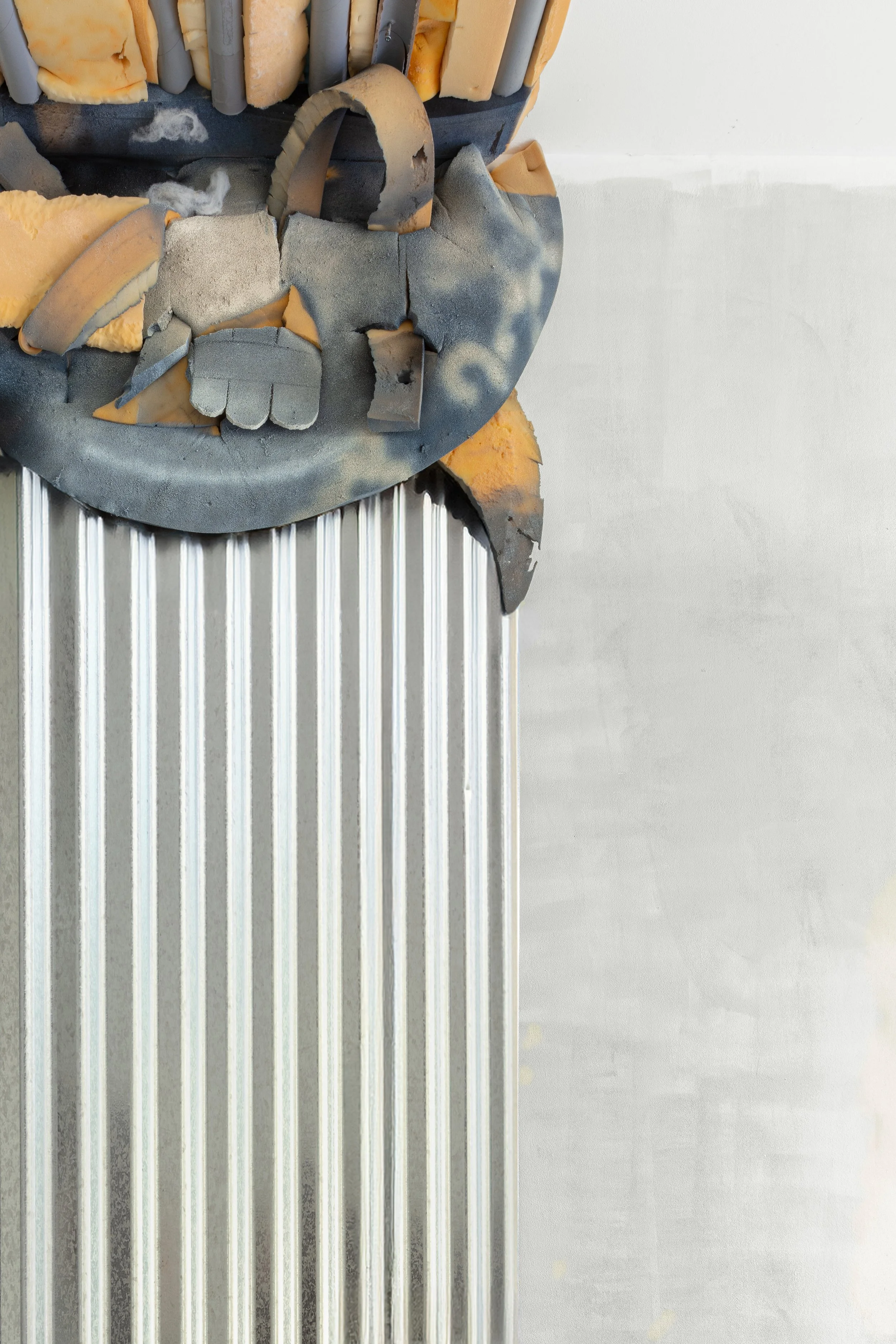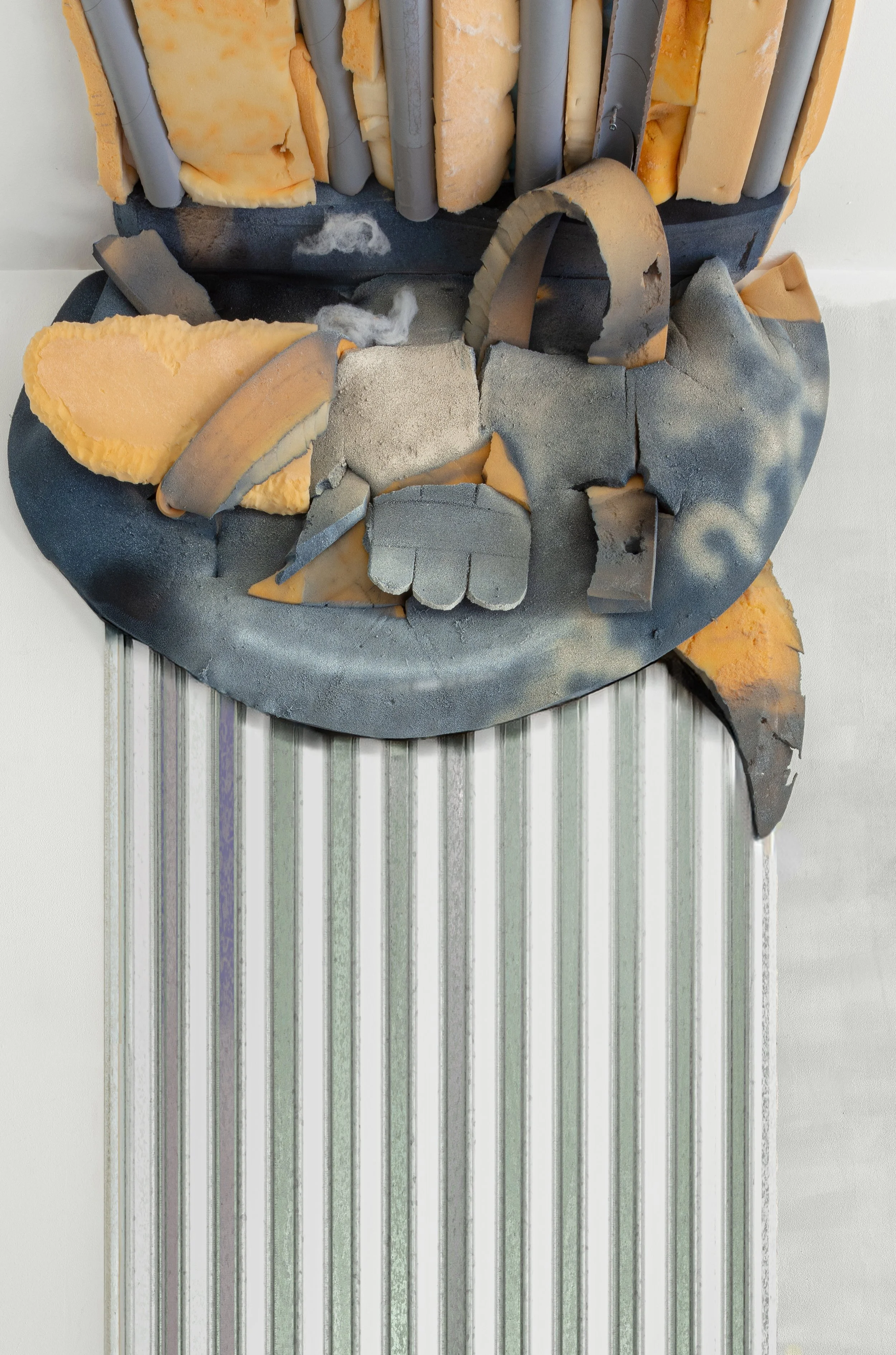 aluminum sheets, aluminum chair frame, painted cushioning, wire, bolts, nuts, failed acrylic paintings